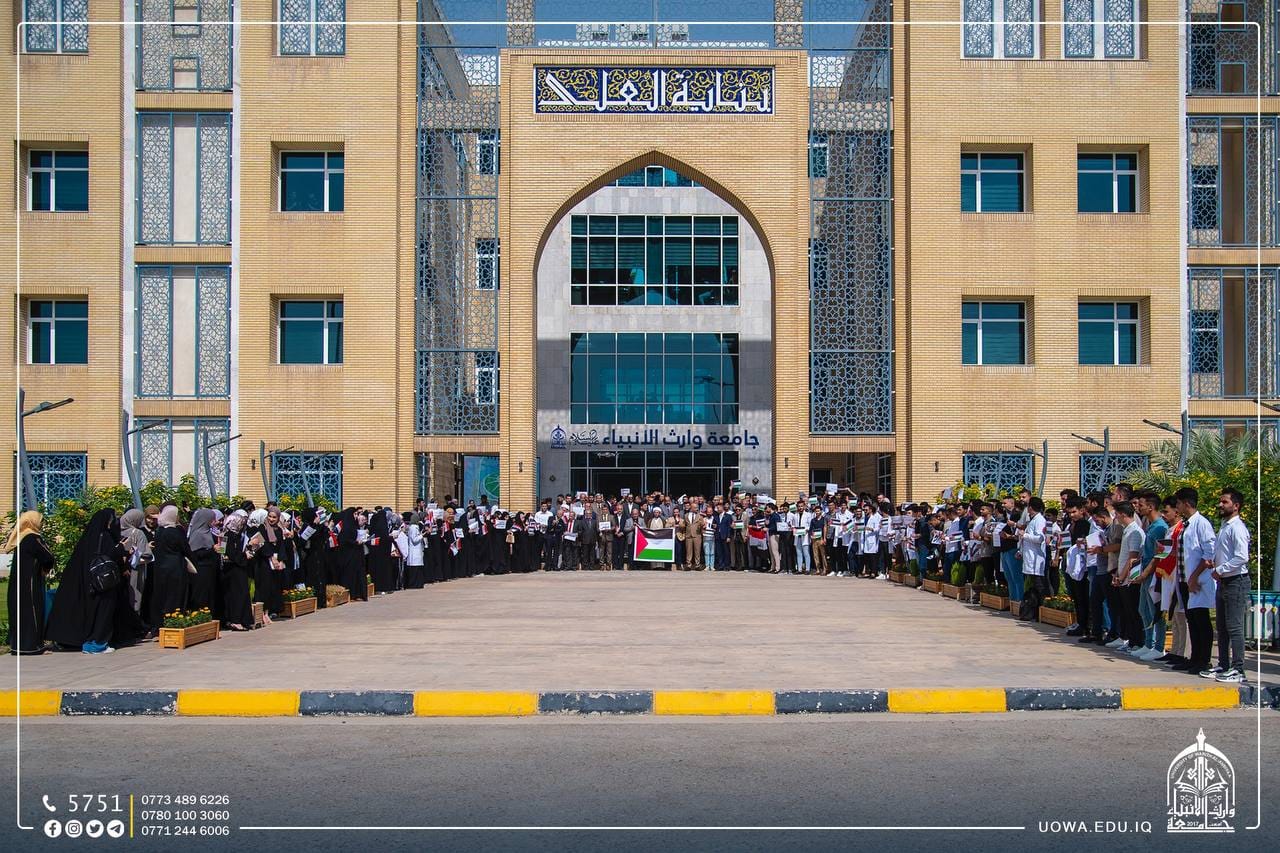 "In conjunction with the declaration of a state of mourning in Iraq," The University of Warith Al-Anbiyaa (peace be upon him) is organizing a solidarity stand with the Palestinian people and condemns the attacks on innocent civilians at the "Al-Mu'adami" hospital. It reaffirms its support for the brave Palestinian people in their resistance against the occupiers. The entire world is called upon to stand against this heinous brutality and prevent the Israeli forces from executing their plans to cause more harm to the oppressed Palestinian people. All of this is happening in full view and hearing of the entire world, with no deterrent or hindrance. There are even those who support these criminal acts under the pretext of self-defense. We ask Allah to assist them and grant them victory, for victory comes only from Allah, the Mighty, the Wise.
