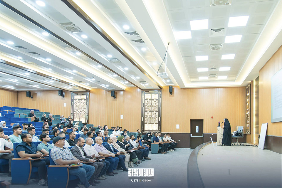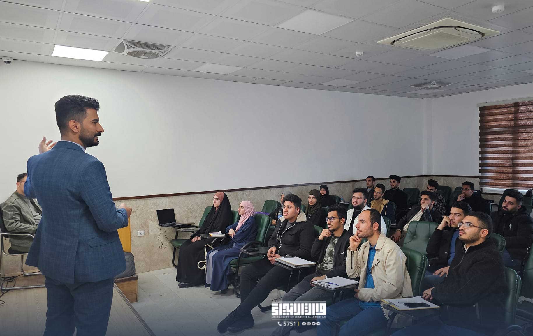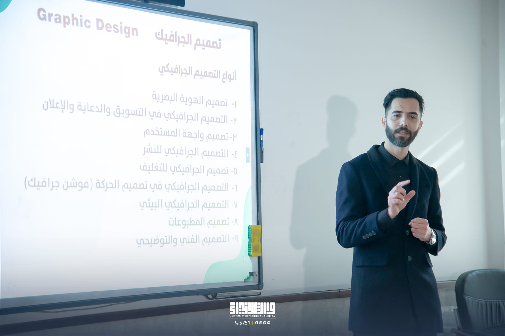In the presence of Mr. Ibrahim Al-Hayawi, the University President, and Dr. Mohamed Jamal Al-Taif, the Dean of the College of Media, the Department of Digital Media at the College of Media, in collaboration with the Media Department at the Holy Hussainiya Shrine, organized a scientific workshop titled "Digital Design Using Artificial Intelligence Techniques" presented by designer Osama Adnan Al-Khayyat from the Media Office of the Holy Hussainiya Shrine.