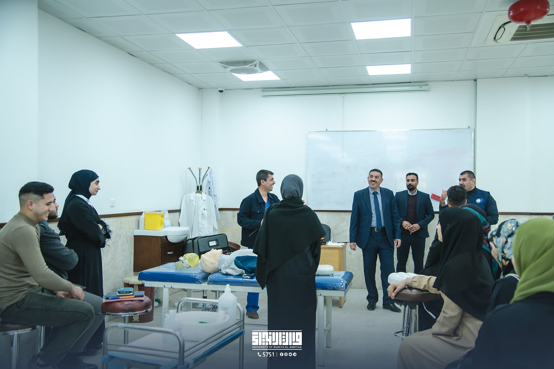 In collaboration with the Regional Centre for Emergency Medicine, the College of Medicine at the University of Warith Al-Anbiyaa (PBUH) arranged a training workshop on advanced first aid (BLS) at the College laboratories. The event was witnessed by the President of the University, Dr. Ibrahim Al-Hayawi, the Dean of the College of Medicine, Dr. Ali Abd Saadoun Al-Ghazi, and the Director of the Centre for Emergency Medicine, Dr. Fadel Okla Al-Rubaie.